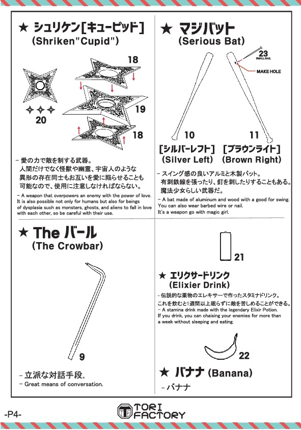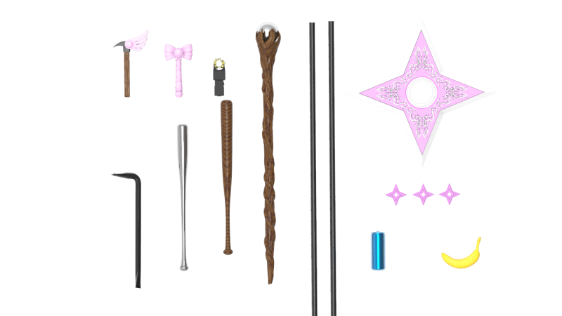 收錄有從魔法到非法的:一槌不醒的深夢之仗aka鐵鎚、愛之魔法棒aka電擊棒、雙棍流真實的鋼筋、屬性打擊的賢者之仗、邱比特手裏劍,以及鋁製的嚴肅棒棒aka球棒、鐵撬、香蕉,長生不老藥等,以為魔法少女的MP耗盡了?真正的戰鬥才剛開始呢~