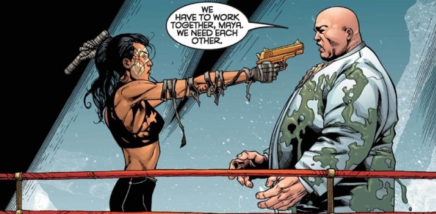 克林特知道瑪雅父親的死背後主謀是她的老大。這點還原了漫畫中的劇情,金霸王欺騙她夜魔俠殺了她的父母,但真正的主腦是金霸王。