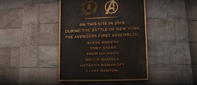 有趣的細節是,紀念碑上寫著『復仇者聯盟第一次集結』,不過實際上美國隊長每次想呼喊這句漫畫中的經典口號都被打斷,直到《終局之戰》才喊出;另外,紀念碑上並沒有實際領導人尼克福瑞的名字,反而以史帝夫羅傑斯的名字開始,象徵他以美國之名帶領這場戰役;另一個值得注意的是,雷神索爾也是使用他的全名 - 索爾奧丁森(Thor Odinson)。