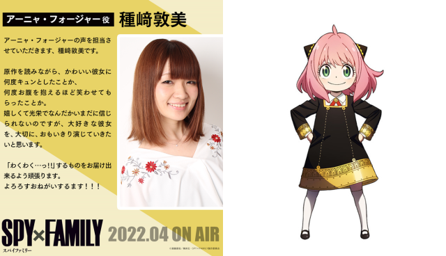 據情報,曾為《鄰座的怪同學》(となりの怪物くん)、《約定的夢幻島》(約束のネバーランド)配音的種崎敦美,將在《SPY×FAMILY 間諜家家酒》動畫TV中,擔任超能力少女「安妮亞佛傑」一角,而女殺手「約兒佛傑」則由資深聲優早見沙織配音。