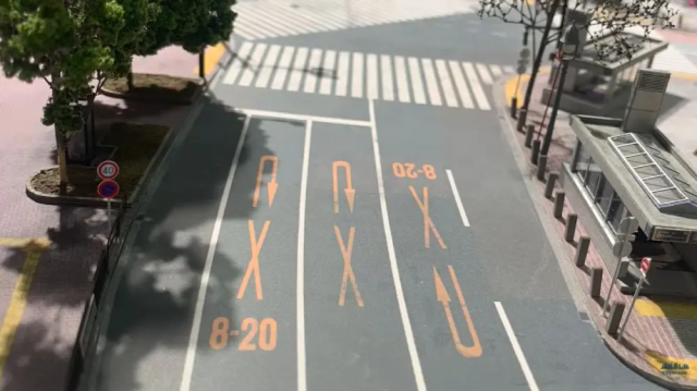 建築物採用雷射切割的紙來加工製作,而交通號誌燈與告示牌則使用 3D 列印打造。他更表示建築物的比例是使用 Google Earth 來測量的,要不然很難透過現場觀察得到數據。整個場景模型大小約 800mm x 450mm x 400mm。