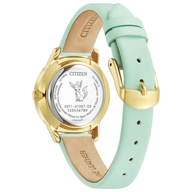 以葉伊布的代表色綠色製作,並以其草系寶可夢的代表在錶面上配置了草系的圖案。錶背印有葉伊布的圖像,驗明正身。