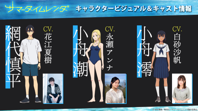 先前也一併公布了聲優陣容,主角網代慎平由花江夏樹配音;女主角小舟潮則由永瀨安奈負責,妹妹小舟澪則是白砂沙帆來擔綱,也算是非常具有人氣的聲優組合。