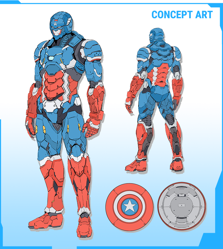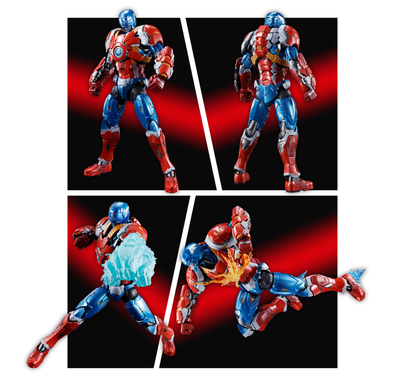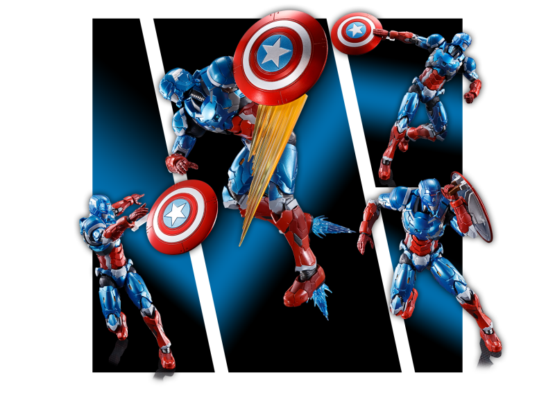 以超級美國隊長之姿參戰,戰甲也同樣搭載鋼鐵人武裝的飛行性能,可透過手、腳的噴射特效零件呈現!另外,盾牌也有獨家開發新技術(日本專利申請中)採用可以結合特效件的設計,讓造型更加靈活多變,展現更豐富的戰鬥風格!