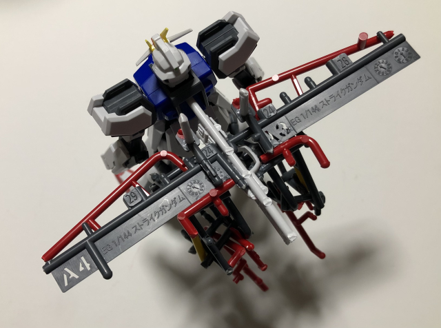 可以看到推主使用的就是組裝零件的邊角廢料,通常這些東西對組裝玩家來說並沒有什麼用處。不過推主藉由這些材料,以不同的色系組裝成一個攻擊鋼彈所背負的背包裝備,有如正規的攻擊鋼彈武裝一般,徹底的讓 EG 系列的入門款再次提升它的可塑性。