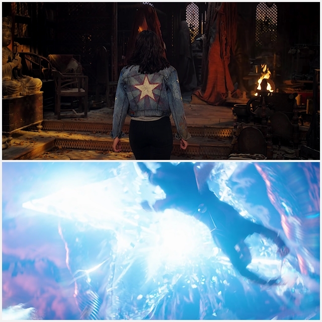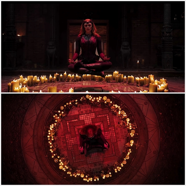 汪達化身緋紅女巫,漂浮在一圈蠟燭陣上方,似乎正在進行某種儀式。她的手指正在逐漸發黑,正如同《汪達幻視》結局阿嘉莎施法時一樣。值得注意的是,從其地面的圖騰和深厚的雕像,說明她所在的地方是卡馬泰姬至聖所的廣場。