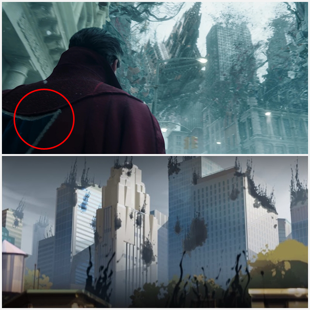 史傳奇發現城市正在被吞噬,這點對應了我們在《無限可能:假如...?》第四集中的至尊奇異博士的世界毀滅景象。這裡可以留意到一個細節,奇異博士的浮空斗篷明顯經過修補。