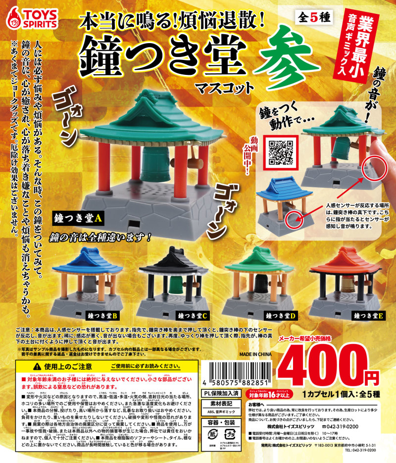 「真的會響喔!煩惱退散!敲鐘堂~參」轉蛋,以日本寺廟「梵鐘(ぼんしょう)」為主題,內建有運動傳感器,透過碰觸敲擊,音效裝置會發出響亮的鐘聲!除了在敲鐘堂的配色上有不同之外,每款的鐘聲也不盡相同~就讓鐘聲淨化想買玩具的慾望(並不會),展開新的一年吧!