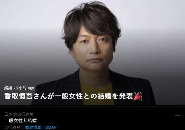 在消息公開後,香取慎吾結婚一事也迅速登上日本Twitter熱搜榜上,成為目前的熱門話題,在得知該星喜事的粉絲朋友們,也紛紛在社群網路上留言打喊恭喜,並且給予最真誠的祝福。