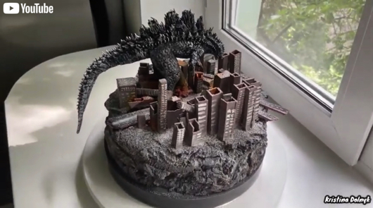 一名來自烏克蘭的蛋糕師傅Kristina Dolnyk以海綿蛋糕做基底,全程手工製作了「哥吉拉蛋糕」,首先利用巧克力醬當作噴漆為基底上色行形成地面,再將巧克力做成的建築物擺放至蛋糕上當作城市,最後就是主角哥吉拉,「它」也是用巧克力製成的,整個製作完畢後就像是哥吉拉立於城市中大肆破壞的場景一樣,但記住,這整個蛋糕都是巧克力,所以欣賞完當然就能吃啦~