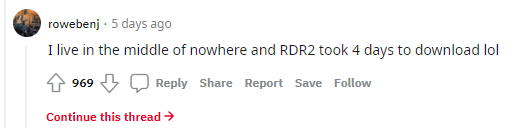 而這一幕情景,也讓底下網友忍不住留言分享自己購買數位版遊戲時的下載經驗,畢竟也並不是每一個人家裡的網路速度都是這麼的快,因此也有人表示,因為住家本身比較偏僻,導致他為了下載《碧血狂殺2》(Red Dead Redemption 2),整整花了四天的時間才完工。