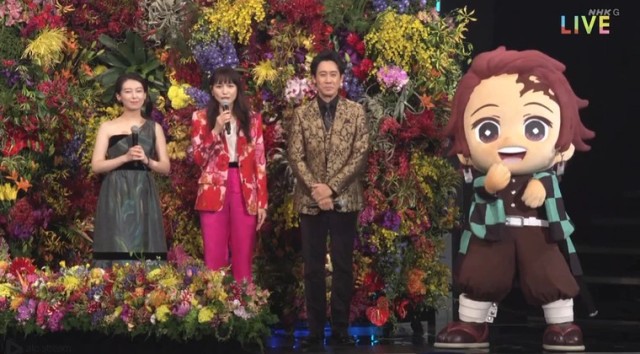 ▼演唱《鬼滅之刃》時,也邀請了知名聲優花江夏樹參與本次紅白活動,為「炭治郎」人偶裝配音