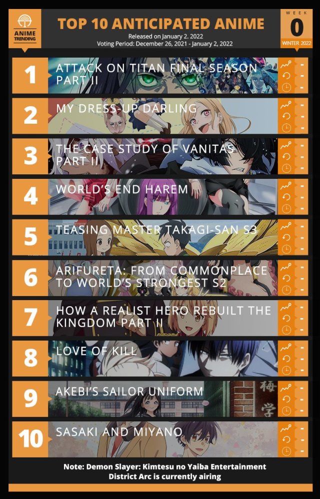 也因為《進擊的巨人》本身的超高人氣,在這一次的AnimeTrending票選排名當中,是毫無懸念的拿下「2022年冬季新番最期待的動漫」第一名的寶座,而僅次於《進擊的巨人》的則是將在1月8日起開播的青年漫畫改編動畫《戀上換裝娃娃》,第三名則為由BONES製作的漫改動畫第二季《瓦尼塔斯的手札》。