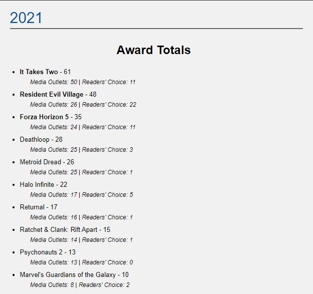 至於Game of the Year Tracke的獎項排行,位居《雙人成行》後面的,則是由CAPCOM所開發的《惡靈古堡 村莊》(バイオハザード ヴィレッジ),分別拿下了26個媒體獎、22個玩家獎,總和為48個獎項,而第三則是競速遊戲《極限競速 地平線5》(Forza Horizon 5),共獲得24項媒體獎、11項玩家獎,合計35個獎項。