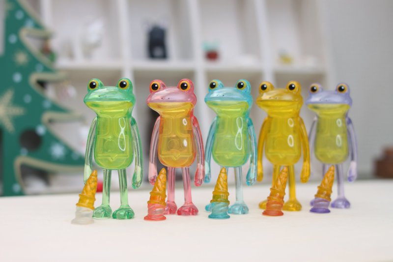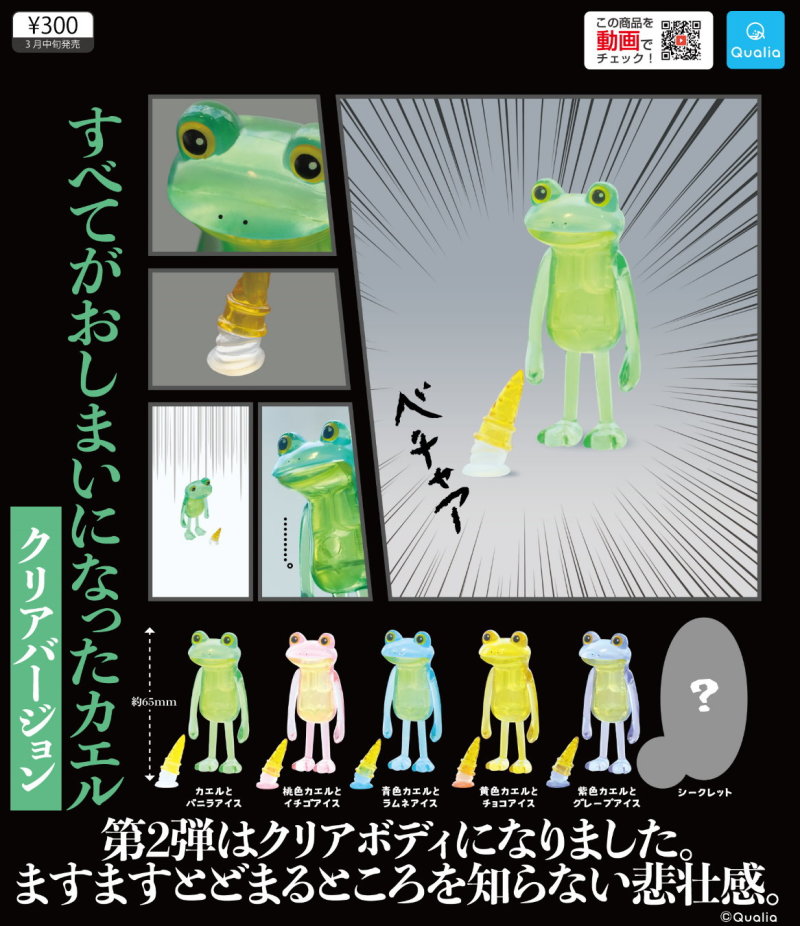 一切都結束了的青蛙轉蛋,以傻眼青蛙、懷疑蛙生的搞笑表情爆紅,除了生動的神態之外,掉在地上的扁掉小冰淇淋也是一大亮點!而 Qualia 也把握機會再度推出彩透版本的蛙蛙,有別於原本馬卡龍的繽紛配色,本次以晶瑩清透的綠、粉紅、黃、紫五色再度現身!連冰淇淋也變成透明版本,營造不同質感卻同樣淡淡哀傷的無奈蛙蛙!