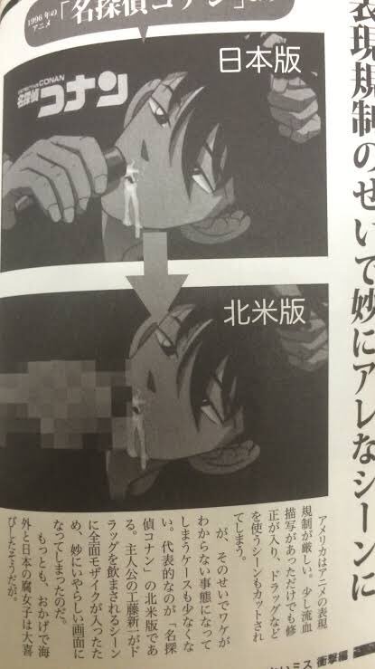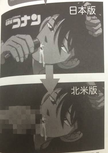 也許是因為美國本身藥物議題的關係,在《名偵探柯南》中工藤新一被強灌縮小藥「APTX4869」的熟悉畫面,在美國卻是直接打馬賽克處理,就好像在台灣只要有抽菸,或是胸部地方打碼的狀況是類似的。