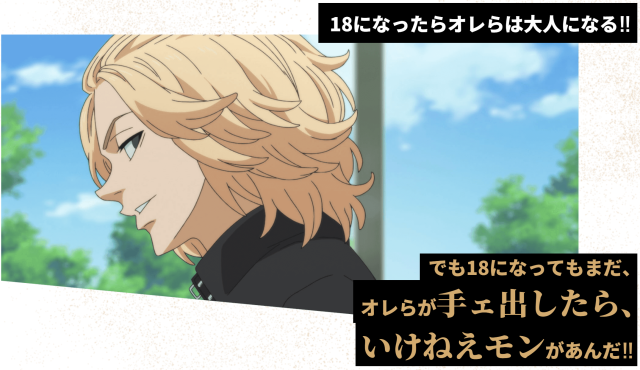 日本最近新修改了一個非常重要的法規,自今年四月起,根據日本《民法》修正案,日本成年年齡從二十歲下調至十八歲,即十八歲為成人。而這與青少年相關這個重要的法規變革,由近年非常人氣的作品《東京卍復仇者》負責宣導,拍攝了相關的宣傳動畫廣告,來告知所有切身相關的日本民眾。