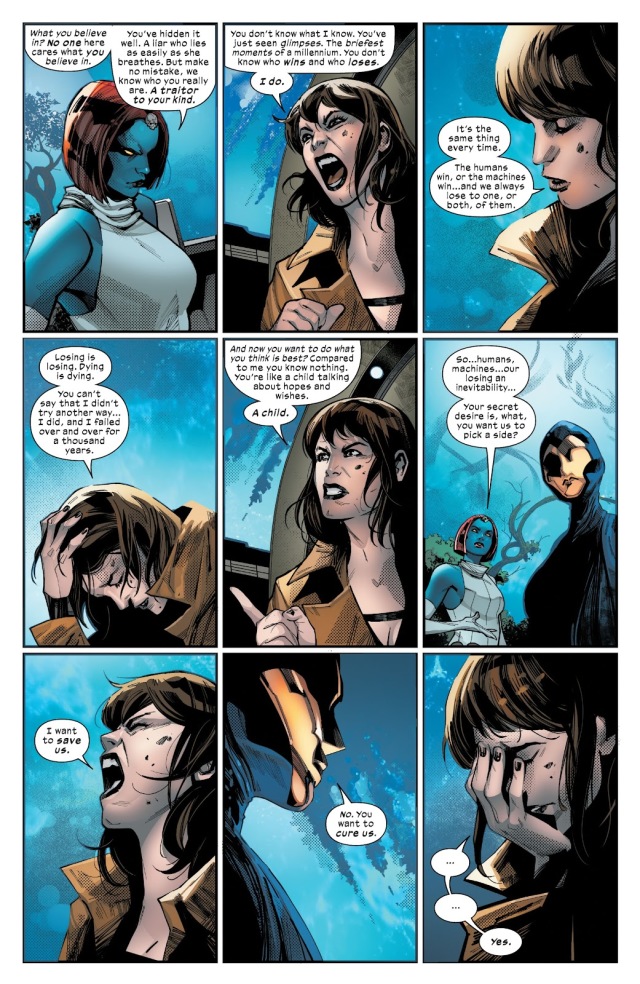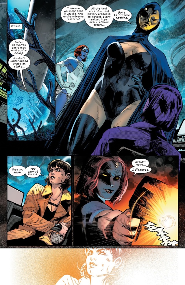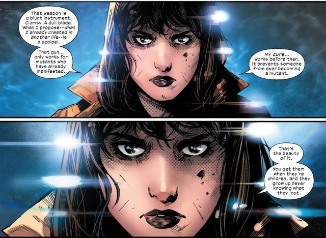 而魔形女和命運女看穿了潛藏在莫伊拉的表象之下的真相:她如此懼怕人類和機械總是會獲勝的未來發生,於是根本不打算拯救變種人,而是打算將變種人全部「治癒」成人類!