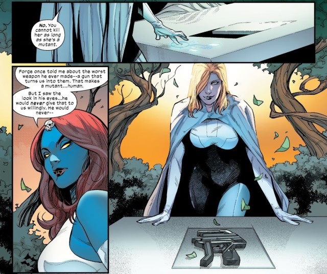 至於她們為何敢這麼做呢?是因為在前一期時,白皇后不只告訴她們如何找到莫伊拉,還把先前在《掠奪者》(Marauders)第十期當中得到的,由變種人「工匠」(Forge)所設計出的變種基因抹除器送給了她們,好解決這個不定時炸彈。