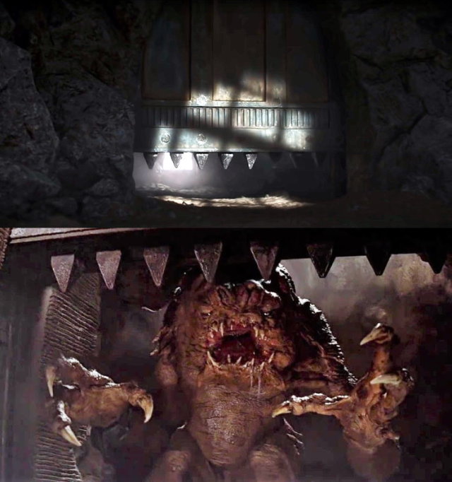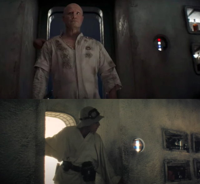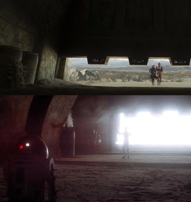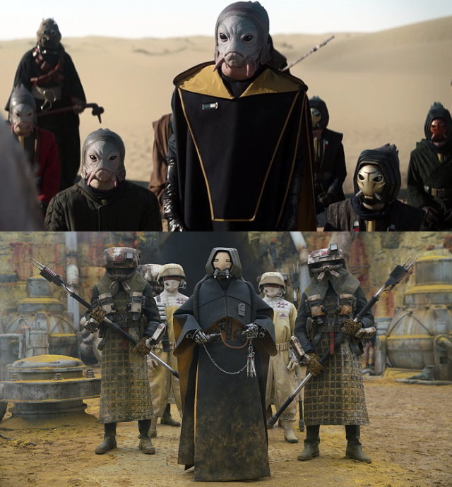 開場就看到芬妮克拉著被俘的刺客走回宮殿,相當程度重現了《絕地大反攻》(Return of the Jedi,1983)的大門場景。