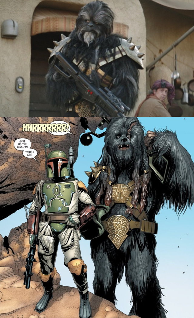 一名武技族的角鬥士也隨之登場,雖然劇中未提及,但該角色名為布萊克科山坦(Black Krrsantan),最初登場於漫畫《達斯維德》(Darth Vader,2015)第一回,是迪士尼星戰新史中的要角。他不僅也是個賞金獵人,亦曾與波巴費特一同受雇於維德大君,額上的傷疤還是由鼎鼎大名的歐比王所留下,這是他首度以實際的演員造型亮相。