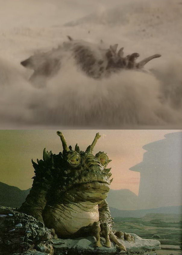 從沙中突然冒出一隻生物,逃跑好一段距離後就被沙人射殺,看起來應該是隻沃特(Worrt),最初登場於《絕地大反攻》,可見到在賈霸宮殿外以長舌捕食獵物。