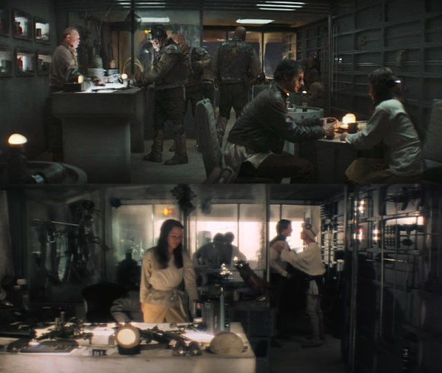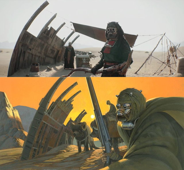 白晝下返回營地的波巴費特帶回了一根折下的樹枝,隨後由族人換上了黑色的突斯肯服飾(正是我們在《曼達洛人》所見的那樣),並親自以那根樹枝打造了自己的加德菲棍(gaderffii stick)。這個武器鍛造處的陳設,似乎正是出自當年 Ralph McQuarrie 為《曙光乍現》所繪的沙人藝術概念。
