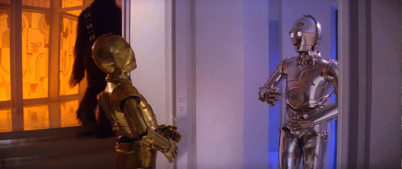 波巴費特親自審問這個不速之客,對方卻回了一句粗話「E chu ta!」,這是赫特語的侮辱用詞,最初是出現在《帝國大反擊》(The Empire Strikes Back,1983),C-3PO剛抵達雲之城時遇到了台同型的禮儀機器人,沒禮貌的對方當下就是這樣回他的。