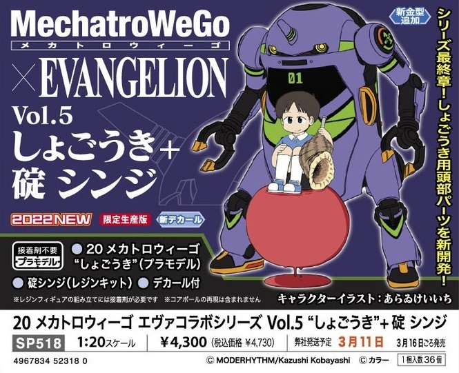 曾經作為模型製作者參與過《新世紀福音戰士新劇場版》的小林和史,此次再度與《新世紀福音戰士》合作,推出 1/20 比例稱的「20 Mechatro WeGo EVA」系列,夢幻第五彈以「初號機 + 碇真嗣」為主角,結合經典機的初號機紫綠配色與機動機器人WeGo可愛的機體設計,並採用全新規開發的頭部零件呈現初號機頭上的銳角造型!另外,附屬有小學生版的真嗣未塗裝模型,Q版的模樣加上(被AV帝王玩壞的)貝殼笛,與先前推出的系列作品一起賞玩,迎來高潮最終章~♫