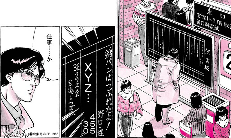 想委託冴羽獠,就必須在新宿車站留言板上寫下「XYZ」 Image credit:漫画全巻ドットコム