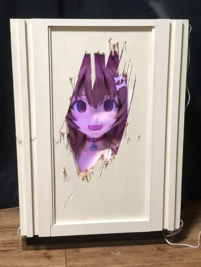 而且這半身像還有專屬展示箱,推主將櫃中裝上燈光並使用與遊戲《邪神沁音》一樣的色調,而且還有個《鬼店》風格的門扇配件,因為裝上磁鐵所以可以直接貼在箱子上,然後沁音的眼睛光澤是可拆卸的貼紙,所以有了破洞的門扇和雙眼無光的沁音,這樣就完成了「邪神沁音」了!