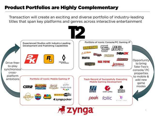 特別是Take-Two還握有旗下兩家電玩公司所發行的《俠盜獵車手》、《碧血狂殺》(Red Dead Redemption)、《NBA 2K》、《生化奇兵》(BioShock)、《邊緣禁地》…等系列作品,這讓Take-Two也有意藉由這一次的Zynga收購,來計畫將這些電玩IP移植到手機平台上,這些讓不少玩家似乎也理解,為什麼《俠盜獵車手:三部曲-最終版》(Grand Theft Auto: The Trilogy–The Definitive Edition)也要登陸於iOS 與 Android雙平台上。