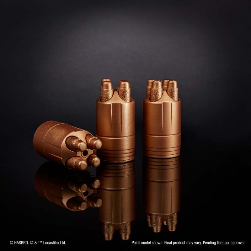 本作的長度來到 76 公分,根據《波巴·費特之書》中造型設定、打造出一把波巴·費特主題配色的超帥 Nerf 射擊器,除了握把部分有表現出木製質感之外,還看得到磨損、掉漆這類的舊化處理,左右兩側分別有著 NERF、STAR WARS 的 LOGO,再來看到射擊把玩的部分,這把 Nerf EE-3 爆能步槍射擊器共附上 3 個彈鼓與 12 發彈鏢,每個彈鼓可以裝填 4 發的金色彈鏢,另外,本作還有搭載音效、瞄準鏡發光功能,推薦給各位星戰粉啦!