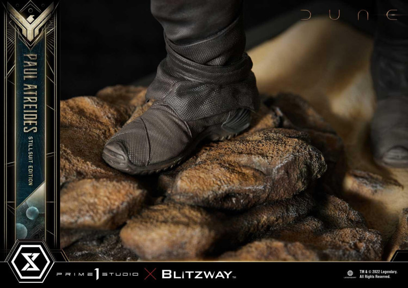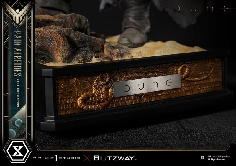 本作高約 53 公分,展現出「保羅」立於厄拉科斯荒漠中的姿態,看向前方的眼神似乎也傳達出他對於未來的不確定感,面部輪廓細膩形塑出演員「提摩西·夏勒梅」帶點陰鬱的氣質,帶有捲度的波浪狀短髮則是以雕髮形式打造,而弗瑞曼人的蒸餾服,在這邊也刻畫出豐沛的皺摺、細節與層次感,還可以自由裝備/卸下布料披風與後背包,另外,能配備於頭雕上的面罩、過濾塞(Filt-Plug)也大大提升了這尊雕像的變化性。
