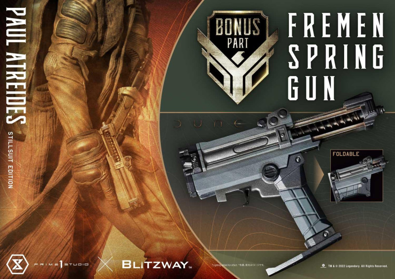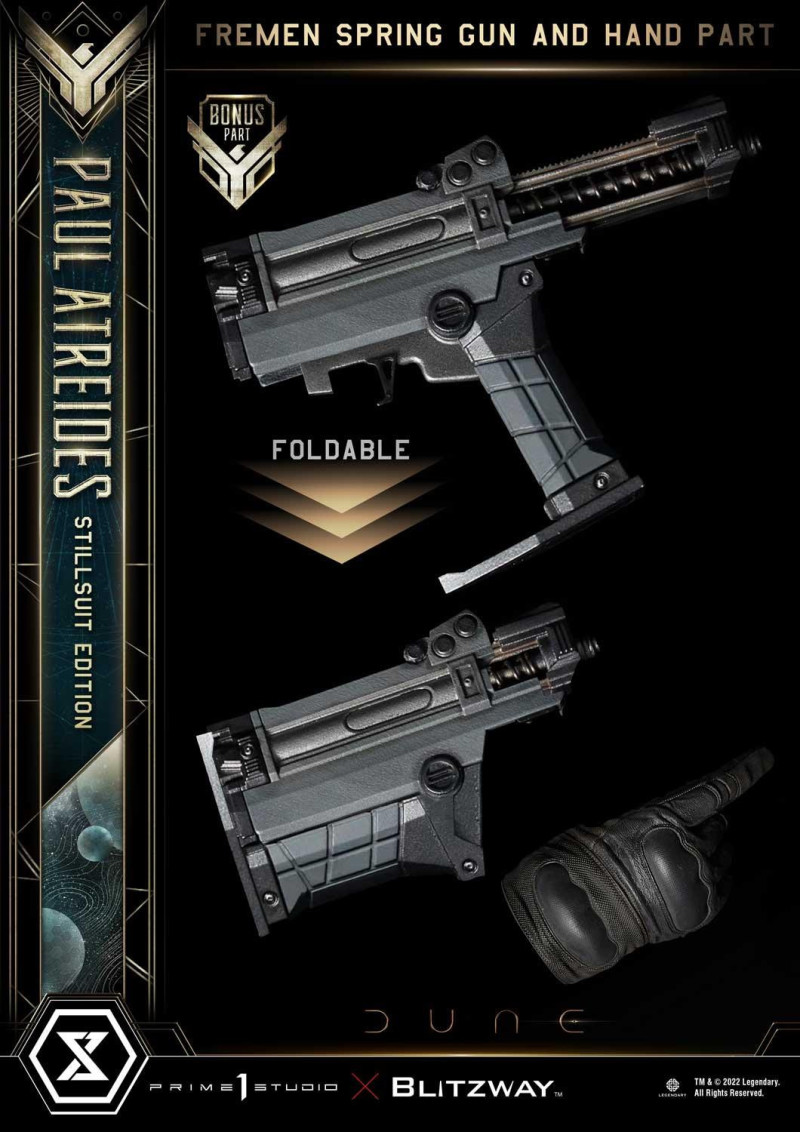 其餘配件還包含了亞崔迪家族的戰鬥刀(Combat Knife)、連刀鞘的腰帶,以及弗瑞曼人以沙蟲之牙打造的晶刃匕首(Crysknife);特典部分則是槍跟替換右手零件!