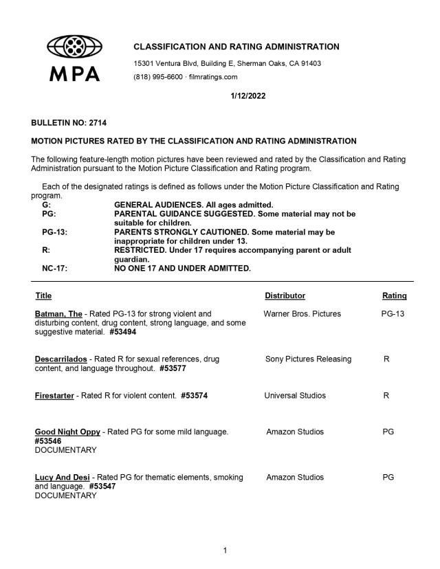 而日前該部電影也終於正式獲得了美國電影協會(Motion Picture Association,以下簡稱:MPA)的評級,根據MPA官方描述,《蝙蝠俠》電影雖內容含有強烈暴力元素與令人不安的內容,以及毒品、極端且暗示性言語等內容,但最終給予本片的分級結果並非是絕大多人所猜測的R級,而是被評為PG-13。