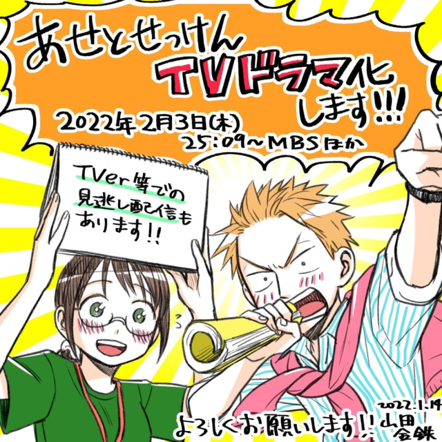 由漫畫家山田金鐵所創作的漫畫作品《汗水和皂香》(あせとせっけん)在今日 ( 1/14 ) 宣布,將翻拍為真人版日劇,目前確定由劇團EXILE成員-佐藤寛太與寫真偶像-大原優乃雙主演,預定於 2022 年 2 月 3 日於 MBS 每日放送及神奈川電視台等地方播出。