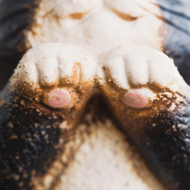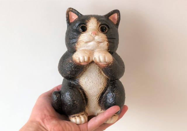 本體高約 18 公分,以精湛的手藝將原繪圖的貓咪以信樂燒的模樣呈現出來,濛濛可愛的碩大雙眼彷彿跟真的貓咪一樣,不同於一般招財貓的造型外,更改為雙手伸起,有種在討錢的感覺 XD。