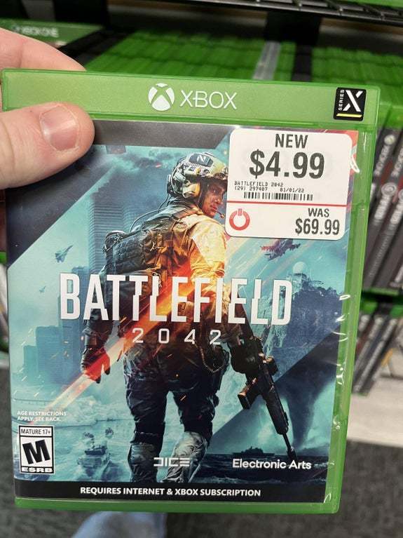 根據Twitter網友GamesNosh(@GamesNosh)所分享的貼文,日前他前往GameStop時,發現架上的《戰地風雲2042》Xbox版本的實體遊戲片,從原本的69.99美金,一路慘跌到只剩下4.99美金的價值,這當然是引起不少玩家們的熱烈討論…以及嘲笑。