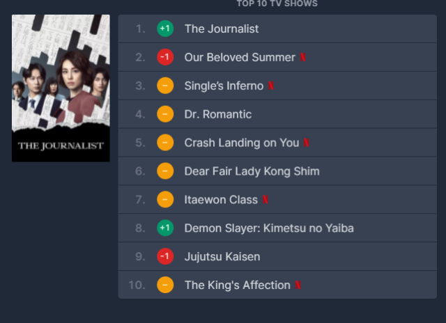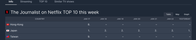 ▼Netflix影集《新聞記者》一開播,就迅速攻佔日本地區的Top 10排行榜,穩坐第一、第二的位置。
