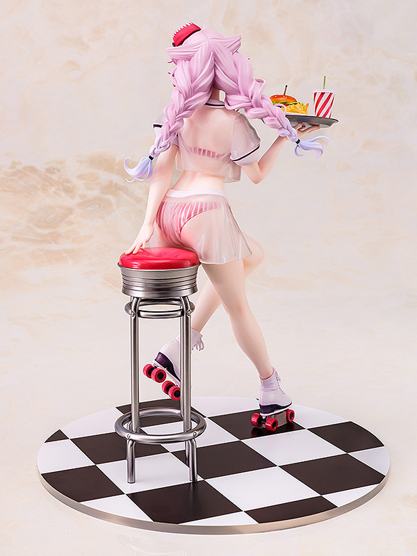 本次 WING 精美立體化的「Marinoa Truless」高約 25.5 公分,根據原畫再現了紅白色的直條紋比基尼與透明短襯衫、短裙,加上腳上穿的溜冰鞋,在強烈的美式餐廳店員印象中,生動地傳達出復古、可愛、性感的氣息,除了白皙的肌膚、帶有漸層色彩的長辮子、細膩描繪的眼睛之外,彷彿妖精一般的尖耳朵、貓耳朵形狀的頭髮,與「DINER」字樣的耳環......等特色也都高度還原,真的美到不行!