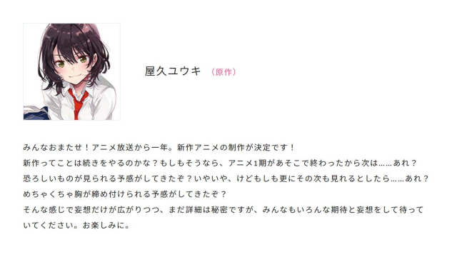 ▼ 原作屋久悠樹也僅表示希望大家期待,新作動畫的細節仍在保密階段