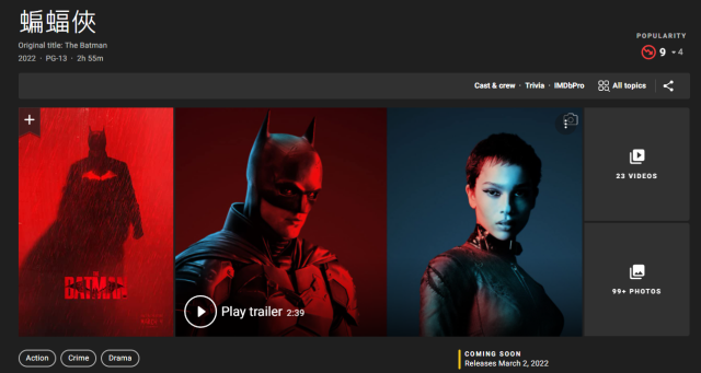 由羅伯·派汀森(Robert Pattinson)所主演的DC電影《蝙蝠俠》(The Batman),在先前通過美國電影協會(Motion Picture Association,以下簡稱:MPA)的評級,以內含暴力元素、令人不安要素…等內容,而正式被評為PG-13後,日前電影資料庫網站IMDb上,也顯示了該部電影的片長時數資訊了。