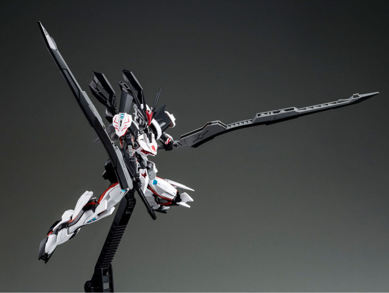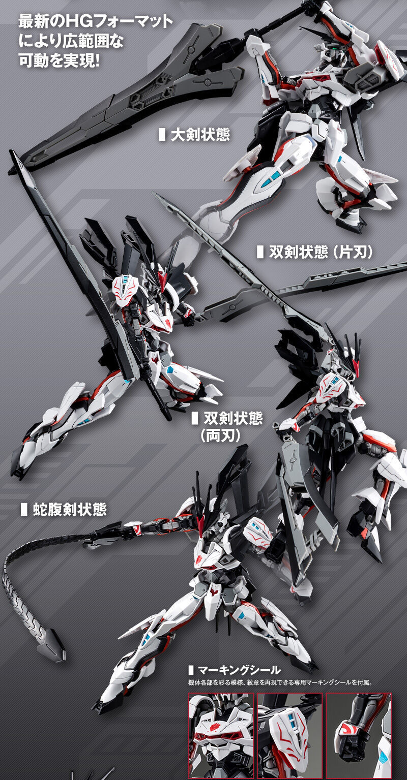 「HG 1/144 王道異端鋼彈Ω」運用新規零件和豐富的成型色再現頭、胸、四肢造型以及背包巨大的劍架、後裙甲的推進器等細節,並附上印有多種機身標誌的水轉印貼紙。特色的主武裝「王道大劍」擁有魄力的大尺寸,並再現分離為兩把軍刀、蛇腹劍的機構。