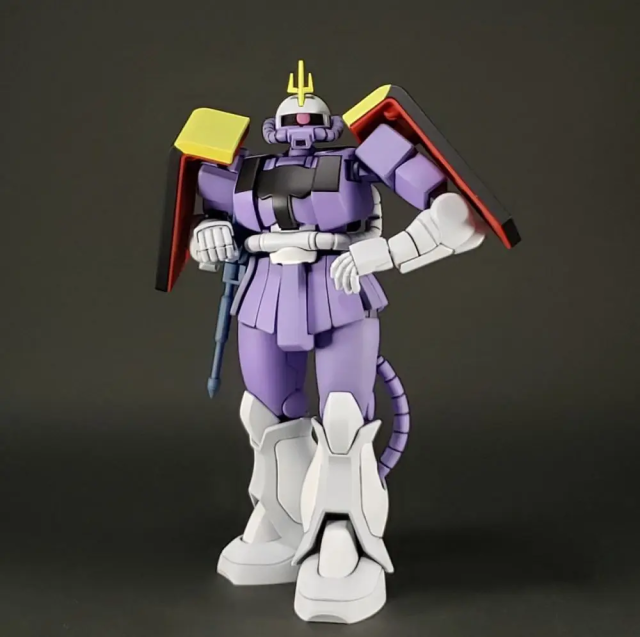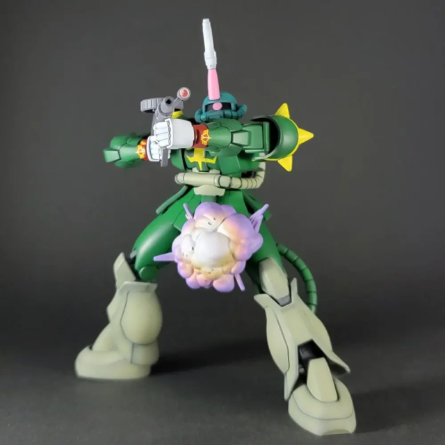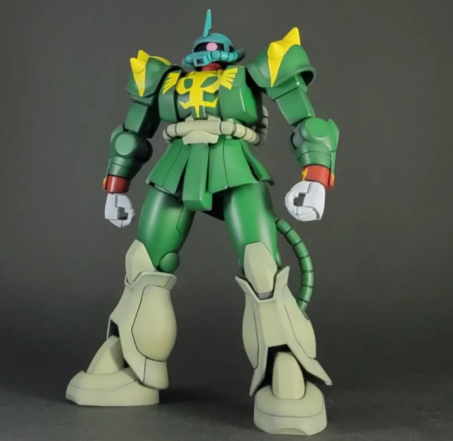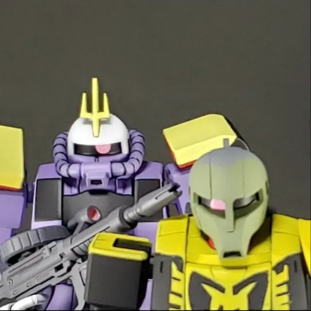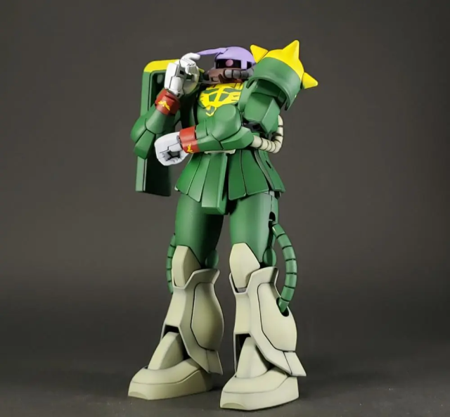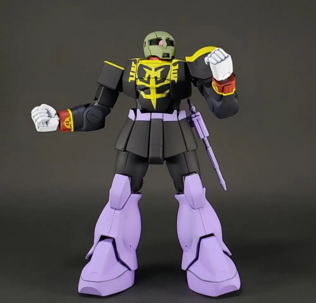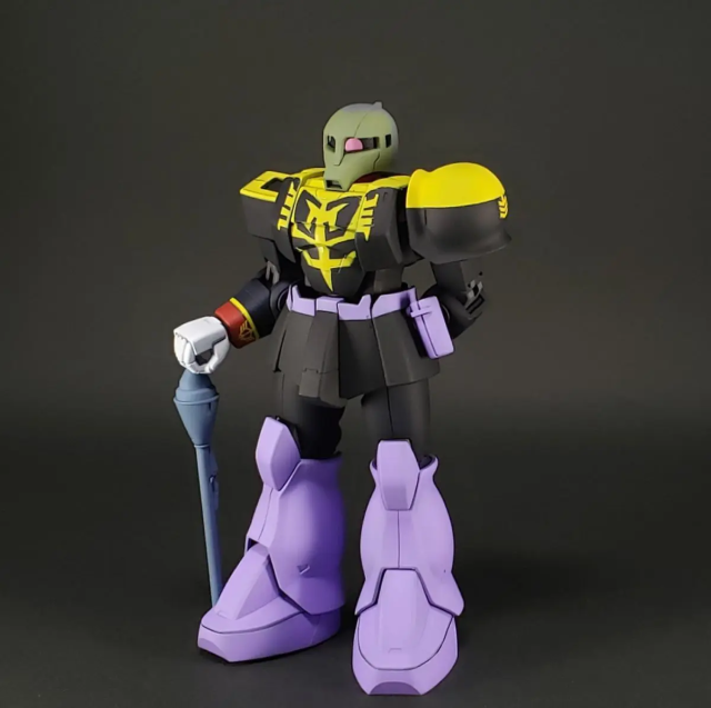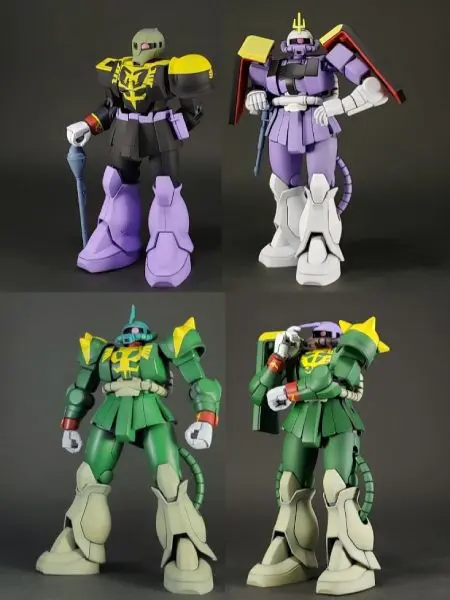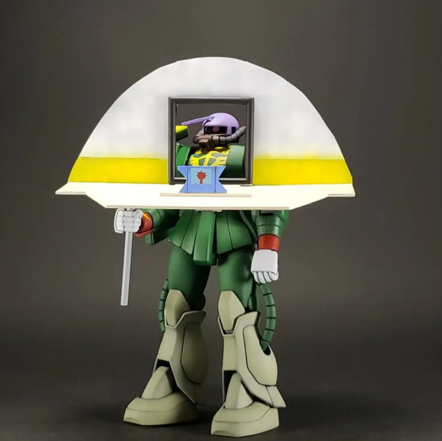 推主使採用 HGUC 的薩克系列機體來製作,對於這樣的製作,他表示因為無法還原臉部的模樣,就只能透過塗裝顏色與拍攝擺設姿態的來呈現角色的特色,當然以包含還原一些名場面的部分,應該會給人更有感覺。