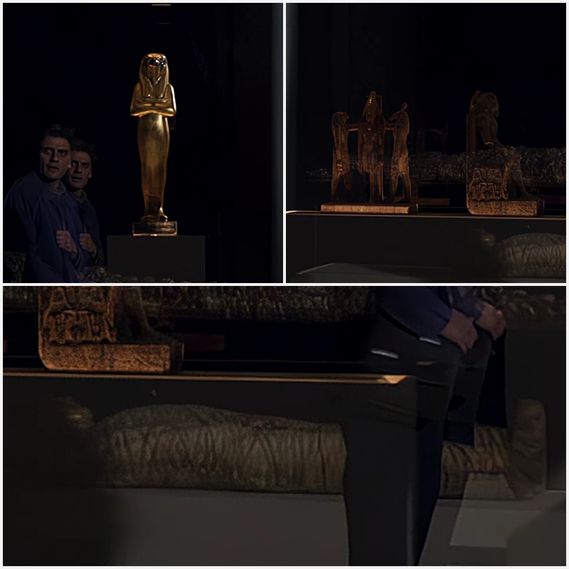 展示台上展示著孔蘇之父“創世神”亞圖姆(Atum)的雕像。 旁邊則放著古埃及太陽神“拉”(Ra)、冥王“歐西里斯”(Osiris)以及亡者的守護者“阿努比斯(Anubis)”的石像。 除此之外,還可以從鏡中倒影看到一具木乃伊。