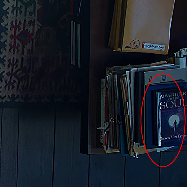 史蒂芬書桌旁成堆書籍最上面的書,其中一本是《靈魂的冒險 穿越物質與靈魂次元的旅程》(Adventures of the Soul: Journeys Through the Physical and Spiritual Dimensions)是一本真實存在的書籍,由國際知名靈媒詹姆斯.范普拉(James Van Praagh)所撰寫。 似乎史蒂芬想藉由心靈層面的來研究自己的人格障礙問題。