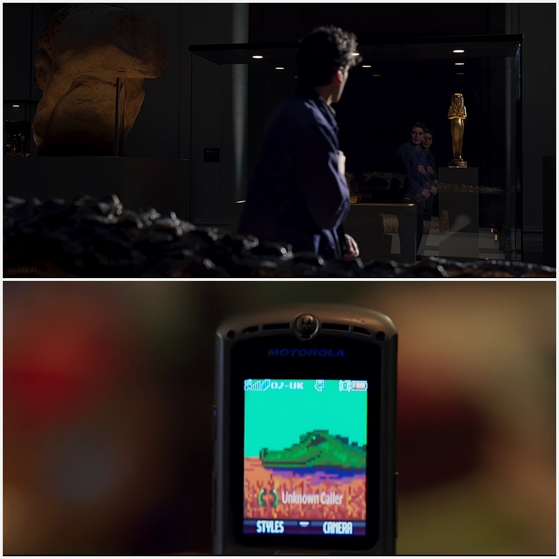 在同一個場景我們可以留意到前景的鱷魚雕像,以及史蒂芬在三角形缺口找到的折疊手機,同樣使用了鱷魚作為桌面圖示。 在古埃及神話中,有一個鱷魚頭人身的神祇名為索貝克,他是辟邪魔法的守護神,能夠守護人民遠離來自尼羅河的災害。