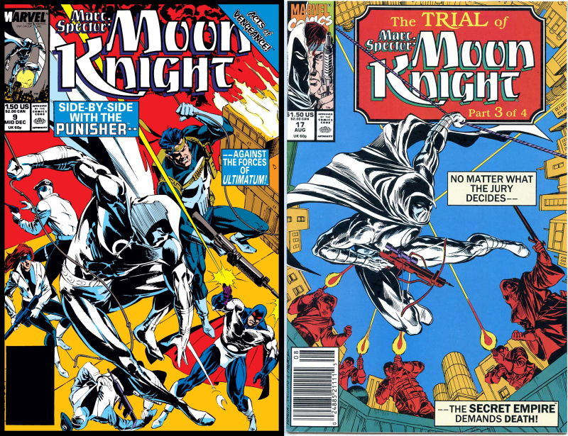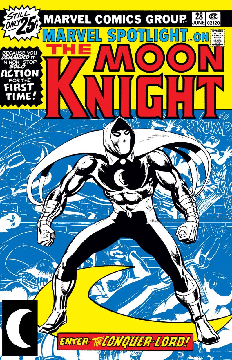 ▼「月光騎士」最初於1975年出版的《狼人夜》第32期(Werewolf by Night #32),在漫畫中以主角敵人的身分登場。 由於這個角色獲得了讀者的熱烈迴響,於是漫威在1976年的《驚奇焦點》第28期(Marvel Spotlight #28)開始推出他的獨立故事。
