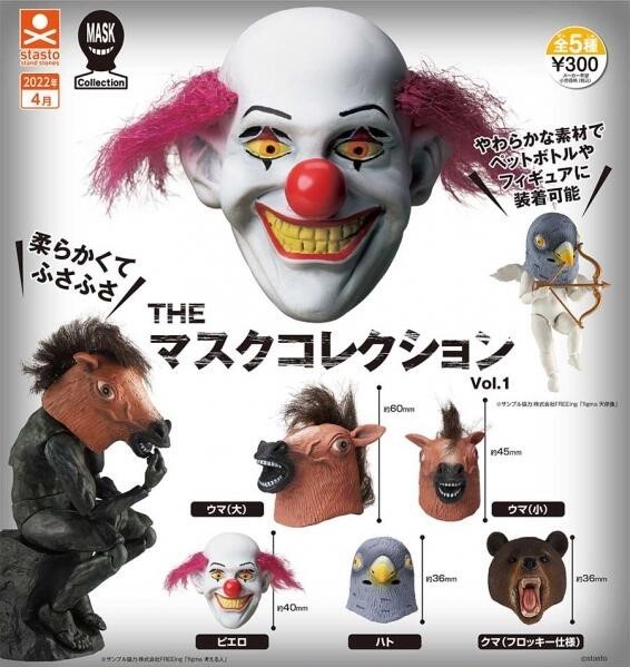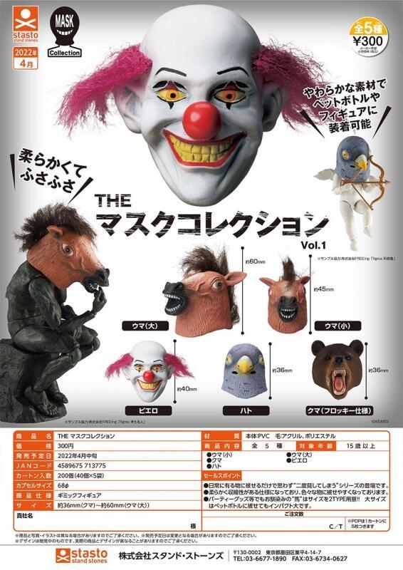 可以作為公仔頭套、可動玩具面具的「THE 面具收藏(THE マスクコレクション)」轉蛋,收錄有:馬頭套(大)、馬頭套(小)、小丑頭套、鴿子頭套、熊頭套,每款尺寸約 36 - 60 mm,讓玩具也能戴上頭套搞笑,玩出新花樣~除了擬真還原頭套猙獰的表情以及眼睛的小洞之外,更採用毛毛材質點綴,增加可玩性!